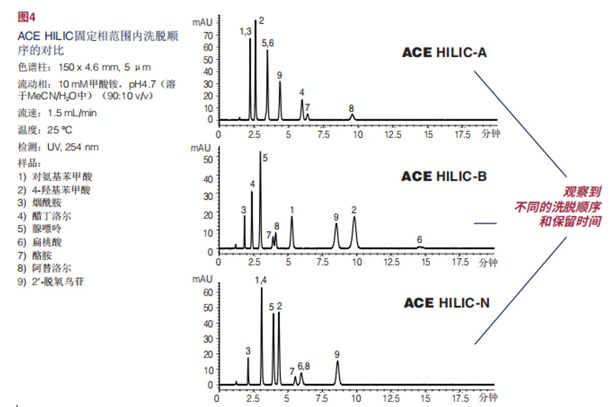 可選擇中性或者酸性、堿性都可以。ACE提供市面常見的酸性(Hilic-A)、堿性(Hilic-B)、中性(Hilic-A)三種固定相Hilic色譜柱方法開發包,可作為分析工作者的首選工具。