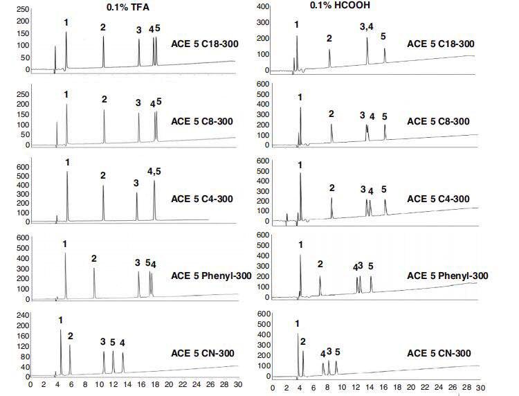 4,pH對多肽保留的影響:在反相色譜中, 多肽的分離一般在酸性環(huán)境下進(jìn)行。