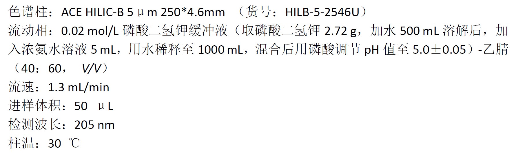 可以選用帶有HILIC作用的色譜柱實(shí)現(xiàn)保留,當(dāng)使用磷酸鹽類時(shí),可以在截止波長(zhǎng)條件下用UV檢測(cè),比較經(jīng)典的應(yīng)用是用ACE HILIC-B檢測(cè)門鳥(niǎo)氨酸: