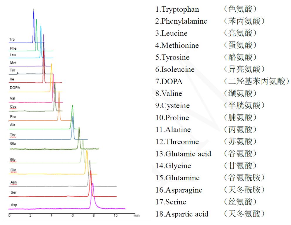 大部分氨基酸由于至少同時(shí)含有大極性的氨基和羧基,因此整體極性很大,常用的C18柱+反相流動(dòng)相對(duì)其保留很弱,同時(shí)部分氨基酸由于紫外吸收很弱,因此讓流動(dòng)相和檢測(cè)器的選擇更有挑戰(zhàn)。