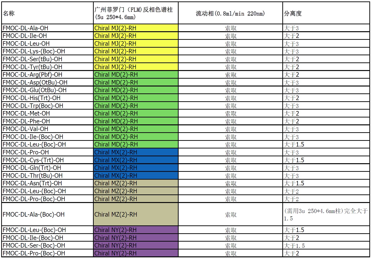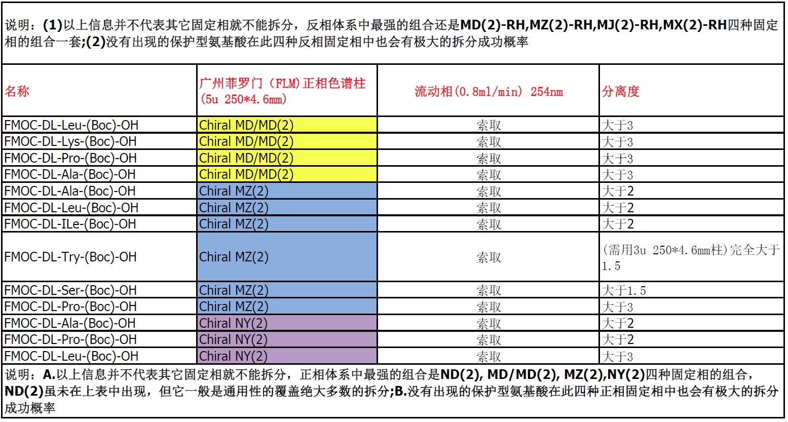 當(dāng)氨基酸上的氨基和羧基用Boc和/或FMOC等保護(hù)起來(lái)時(shí),可以用正相或者反相的多糖類手性柱實(shí)現(xiàn)非常好的分離,有現(xiàn)成的分析方法,可以極大地減少方法開(kāi)發(fā)的時(shí)間。