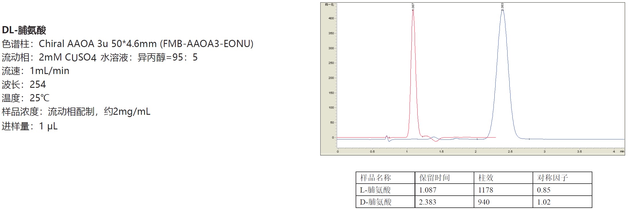 對(duì)于非保護(hù)的氨基酸,菲羅門推出AAOA分析柱,即通過(guò)鍵合D-青霉胺于十八烷基柱上而成的配體交換型手性柱。該手性柱手性柱可以用于拆分α-型有機(jī)酸、α-型非衍生氨基酸及其衍生物、二元胺、二肽、內(nèi)酰胺和氨基醇等。