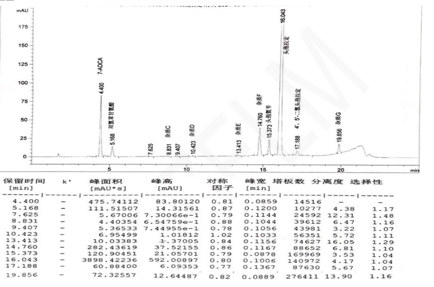 客戶評價:頭孢拉定的保留時間約為 15min,7-氨基去乙酰氧基頭孢烷酸、雙氫苯甘氨酸、雜質 C、雜質 D、雜質 E、雜質 F、頭孢氨芐、4',5'-二氫頭孢拉定和雜質 G 依次出峰,頭孢拉定和頭孢氨芐的分離度應不 小于 4. 0,其他各組分峰間分離度符合規定。