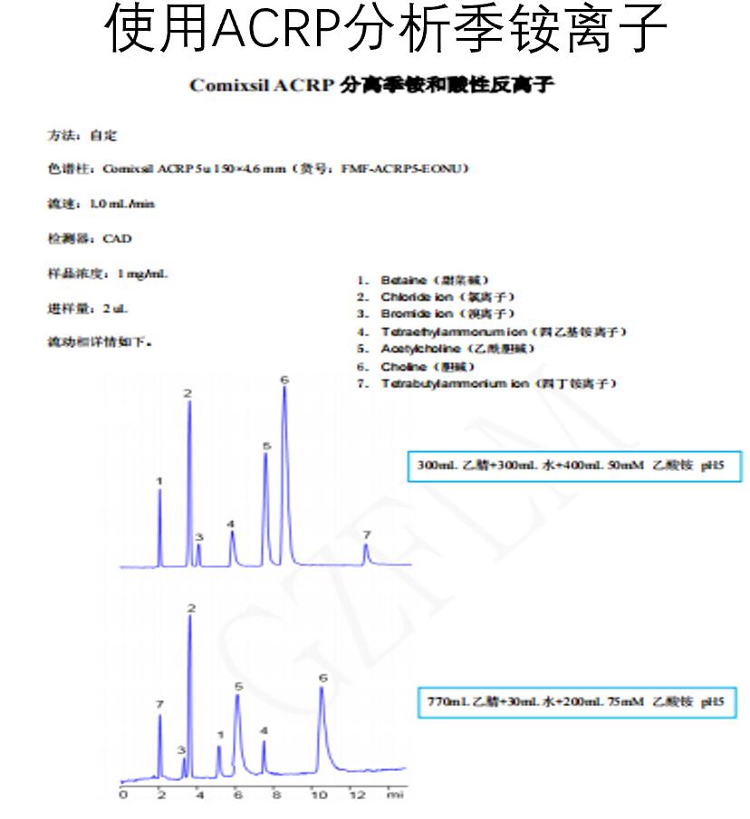 當(dāng)緩沖鹽的PH用到了5,觀察第一個圖譜和條件,四丁基銨離子因為只有一個位點的陰陽離子交換,該流動相條件下幾乎沒有沒有Hilic作用,導(dǎo)致出峰最慢。此PH狀態(tài)下,甜菜堿具有兩個位點的電離,陰陽離子交換比較強(qiáng),所以最先出峰。觀察第二個圖譜和條件,此時的流動相條件下具有Hilic作用,又因為四丁基銨離子是分析物中疏水性最強(qiáng)的,所以最先出峰。