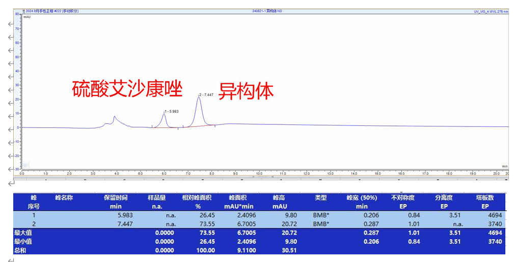 硫酸艾沙康唑及其對(duì)映異構(gòu)體的手性拆分 色譜柱:Chiral ND(2) 5u 250*4.6mm (P/N: FMG-AC5-A01-NFC) 流動(dòng)相:正相(咨詢) 柱溫:25℃ 流速:0.8 mL/min 檢測(cè)波長(zhǎng):275nm 濃度:N/A 溶劑:30%乙腈 色譜圖: