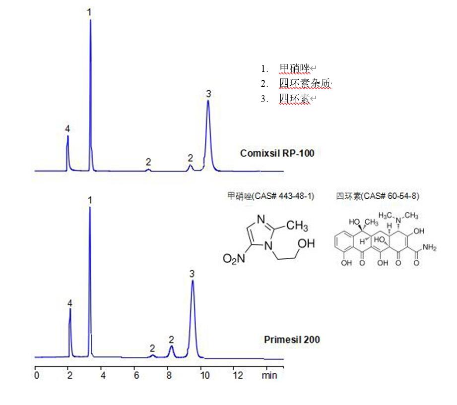 App ID: FLM-C250006 Comixsil RP-100 與 Primesil 200 分析甲硝唑與四環(huán)素 色譜柱:Comixsil RP-100 與 Primesil 200 規(guī)格:3μm 150×4.6 mm 流動(dòng)相:乙腈:水:200mM 磷酸氫二銨(pH2.0 ) = 20:40:40 流速:1 mL/min 檢測(cè)波長:220nm 柱溫:25℃ 色譜圖: