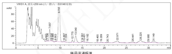 中國(guó)藥典規(guī)定理論塔板數(shù)按甘草酸銨應(yīng)不低于3000,本試驗(yàn)實(shí)際測(cè)出柱效為6143。
