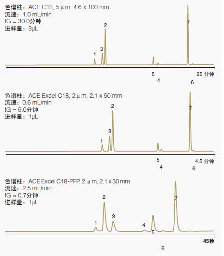 利用UHPLC色譜柱更高的柱效,可在更高的流動相流速下使用更短的色譜柱,以使這種混合物的分離時間縮短80%(相比HPLC色譜柱)。