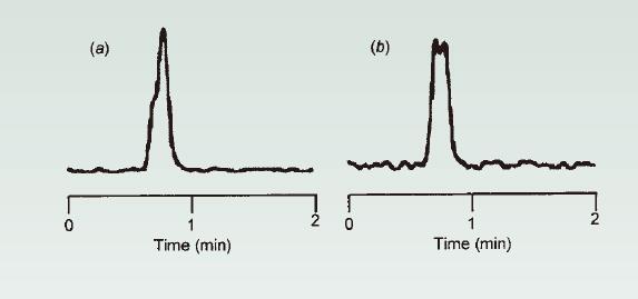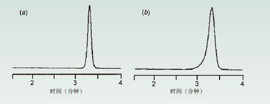 改變柱并未糾正這個(gè)問(wèn)題(更換色譜柱不能解決此問(wèn)題),所以玻璃料(篩板)堵塞并非導(dǎo)致這一現(xiàn)象的原因。如果柱上樣品的質(zhì)量減少(減少上樣量)(圖4b),峰形看起來(lái)更像是兩個(gè)峰,而不是一個(gè)肩形峰。