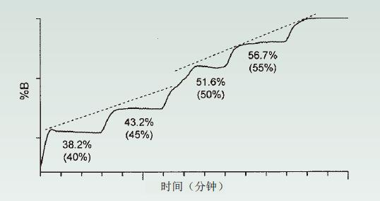 圖8. 圖9顯示了HPLC系統的梯度階梯測試結果。(a)0、10、20、30、40、45、50、55、60、70、80、90和100%B的梯級;(b)以1%的梯級向上跟蹤至45-55%。箭頭顯示了50和51%之間的“較短”梯級。來源[4]。