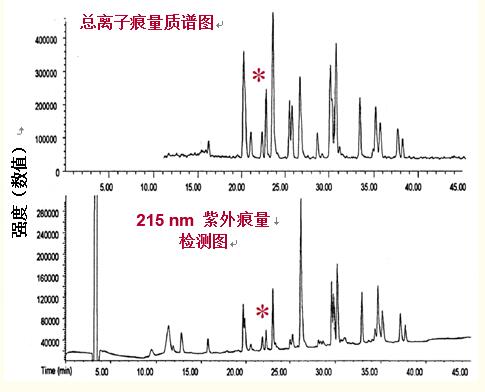 特別是用“*”標示的肽對。它們在UV檢測圖譜中顯示的峰值較小,但在質譜圖中峰值較大。
